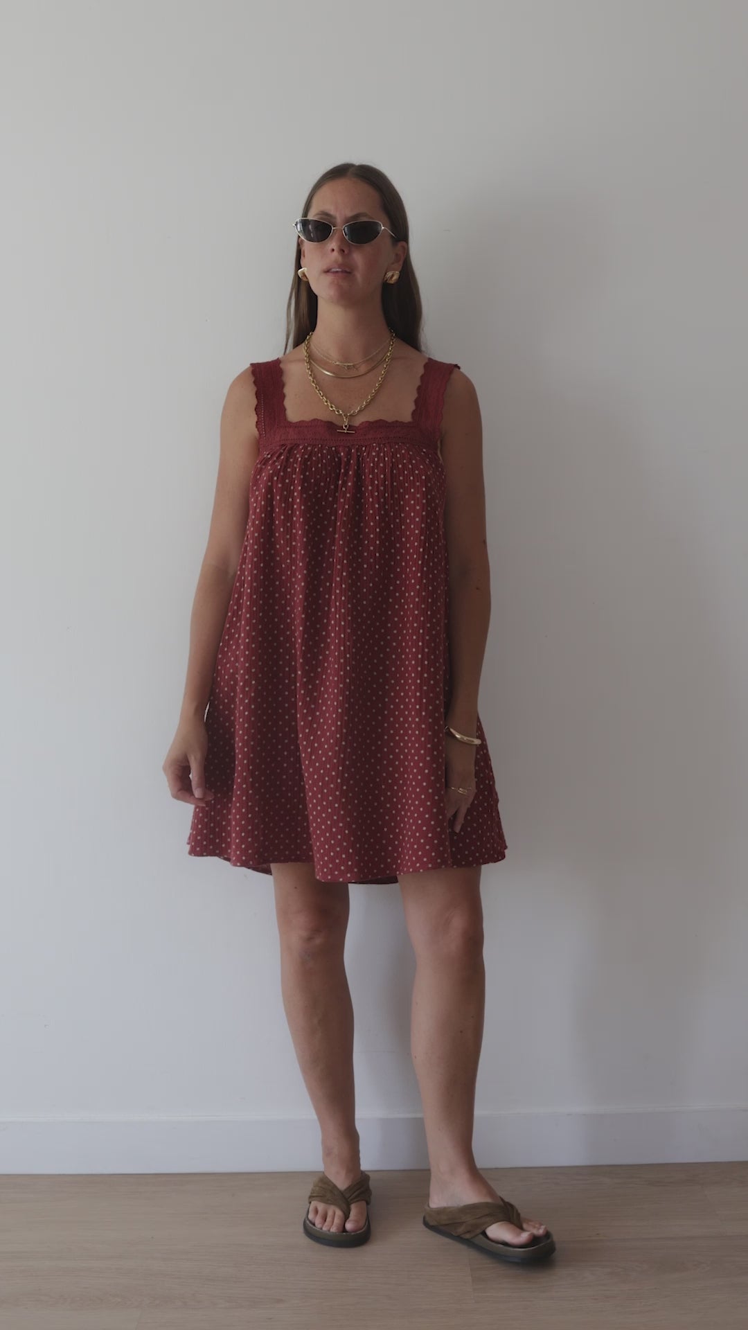 Fall in love with the Juno Mini Dress — a dreamy remake of a 1970s classic. Crafted from the softest double-gauze cotton in a rich chocolate brown with baby blue polka dots, this piece floats effortlessly with every step. Featuring a lowered square lace-trim neckline and hidden pockets, it’s feminine, nostalgic, and made to make you feel something special.