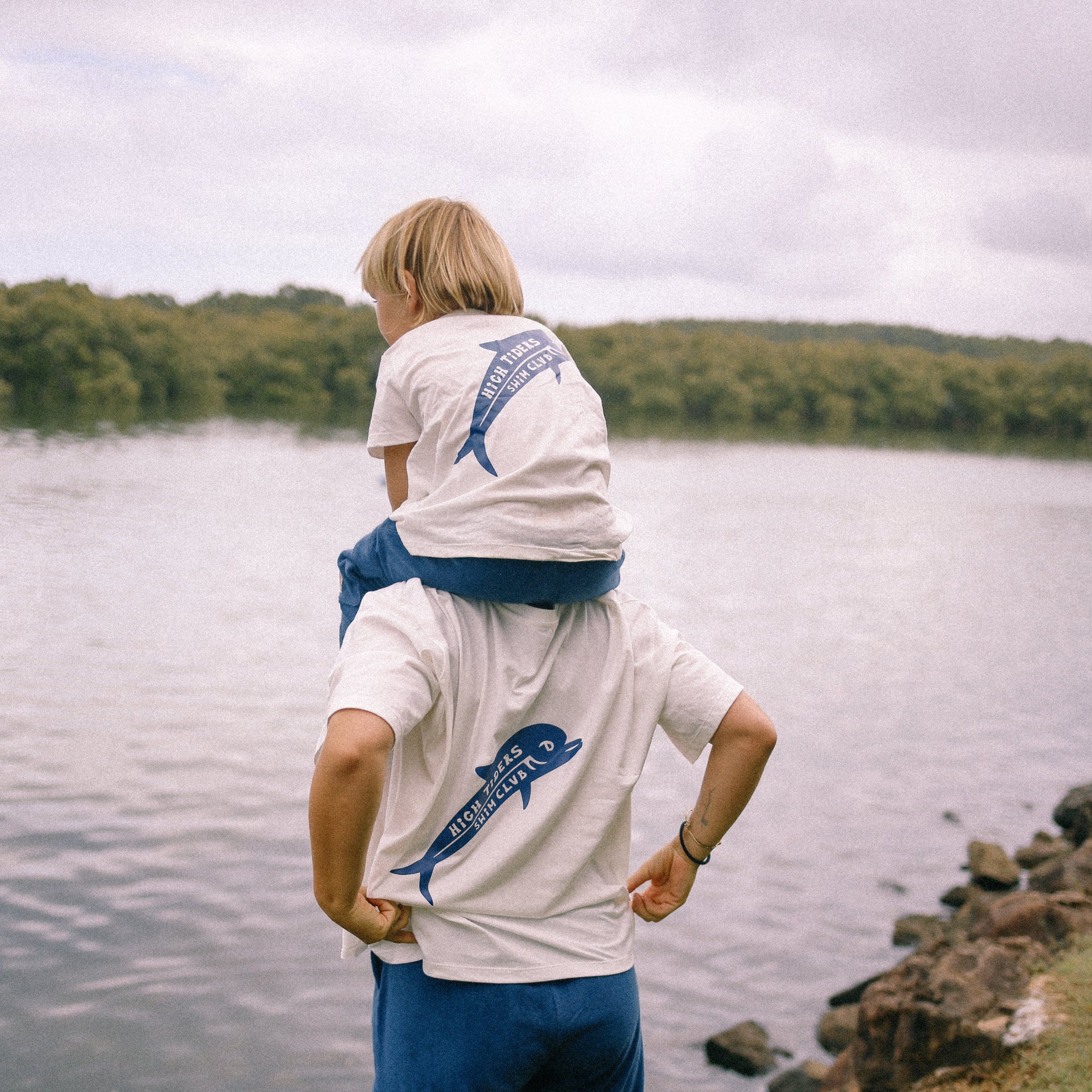 A classic white tee with navy High Tiders dolphin print on the back and circular logo on the front . An oversize box fit, cut on the bias for a flattering drape. The High Tiders Swim Club dolphin graphic pays homage to the legendary Jacques Cousteau, celebrating his timeless passion for the ocean—a perfect match for fellow ocean lovers.