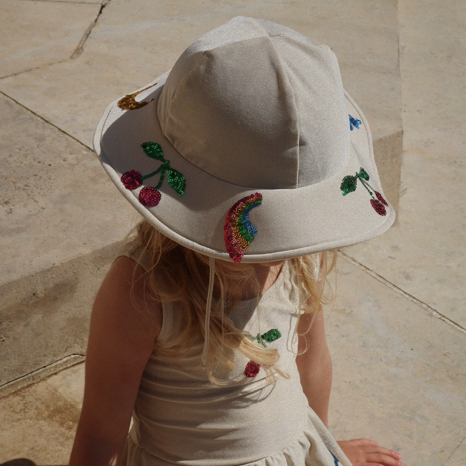 Sun hat with glitter effect and sequin embroidery. Protects against the sun’s UV rays with the highest ultraviolet protection factor, UPF 50+.